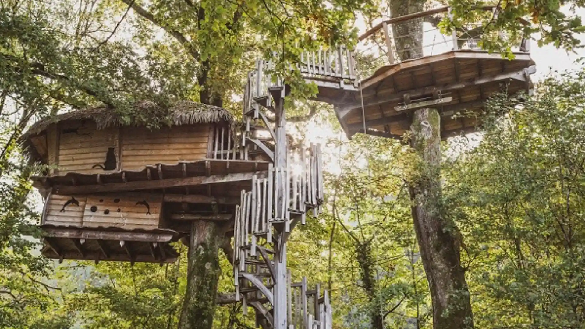 À 7 mètres de hauteur, les formes folles de la cabane Atlantide étonnent et amusent ! Dès votre arrivée, découvrez avec délice les recoins de cette cabane composée d’un lit double et de trois lits simples. Les parents visiteront les fonds marins pendant que les enfants joueront avec les papillons dans leurs nichoirs en mezzanine !